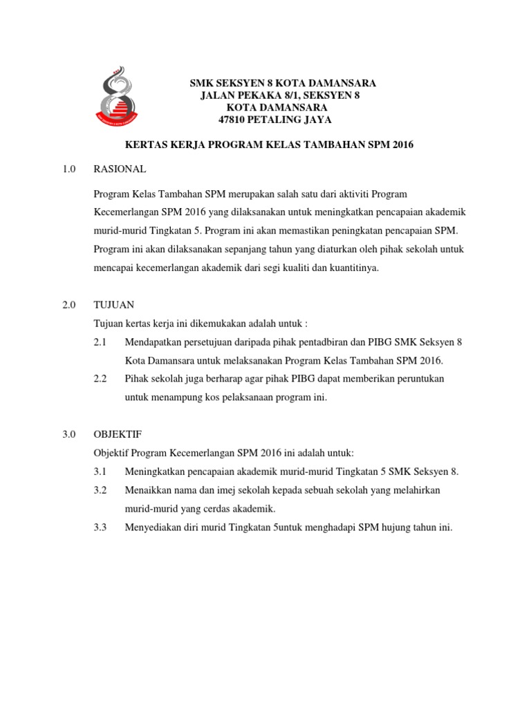SEKOLAH KEBANGSAAN SENGKANG JBA 9012 KERTA KERJA PROGRAM LONJAKAN UPSR 2019 PROGRAM KELAS. View KERTAS KERJA KELAS TAMBAHANpdf from BM 11101 at Sekolah Menengah King George V. Bina insan guru ppg fasa 3 semester 5 2013 salawatiradzali710305025150 13 matlamat 31 kelas tambahan ini dianjurkan dan dilaksanakan dengan matlamat untuk memahirkan murid-murid mahir dalam bahasa malaysia dan mampu menjadikan suatu sumber ilmu pengetahuan dan nilai-nilai murni.